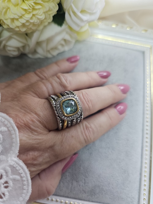 Anel Prateado com rebordo dourado e cristal Azul Mar