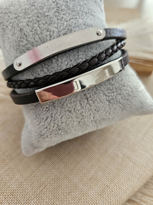 Pulseira com Cabedal Preto Aço Inoxidável de Homem.